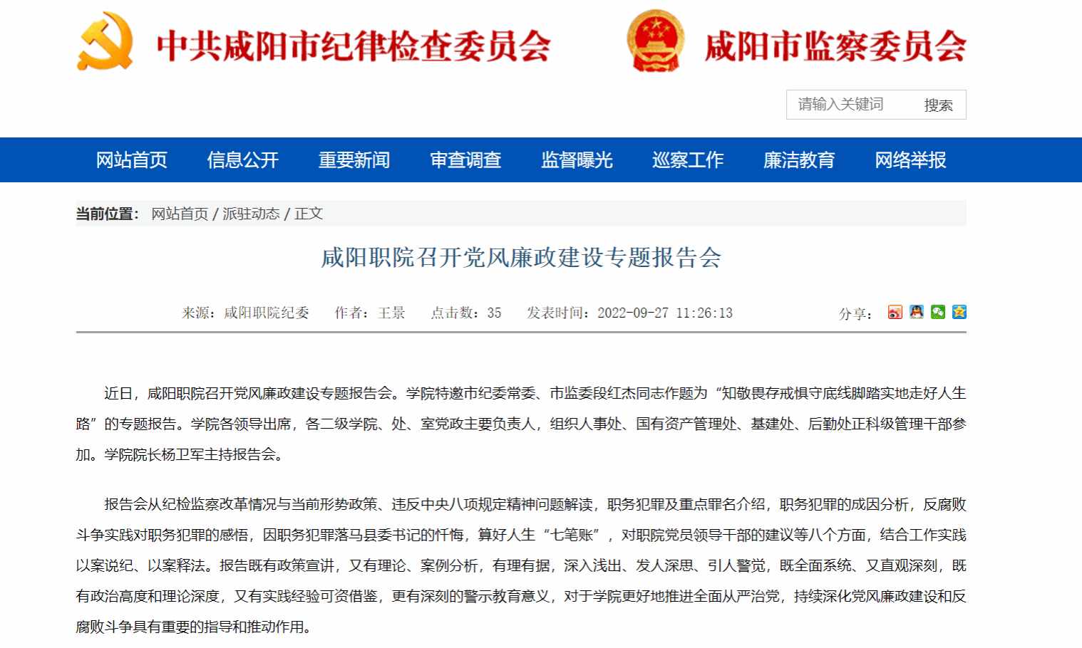 近日,咸阳职院召开党风廉政建设专题报告会。学院特邀市纪委常委、市监委段红杰同志作题为“知敬畏存戒惧守底线脚踏实地走好人生路”的专题报告。学院各领导出席,各二级学院、处、室党政主要负责人,组织人事处、国有资产管理处、基建处、后勤处正科级管理干部参加。学院院长杨卫军主持报告会。