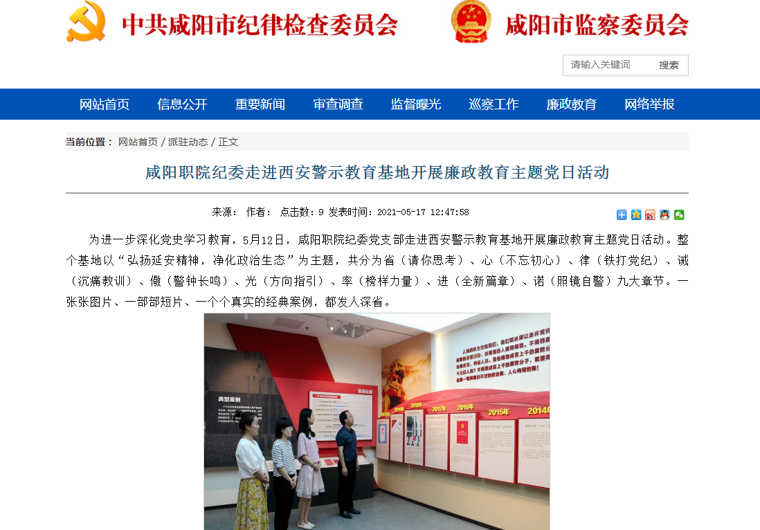为进一步深化党史学习教育,5月12日,纪委党支部走进西安警示教育基地开展廉政教育主题党日活动。整个基地以“弘扬延安精神,净化政治生态”为主题,共分为省(请你思考)、心(不忘初心)、律(铁打党纪)、诫(沉痛教训)、儆(警钟长鸣)、光(方向指引)、率(榜样力量)、进(全新篇章)、诺(照镜自警)九大章节。一张张图片、一部部短片、一个个真实的经典案例都发人深省。