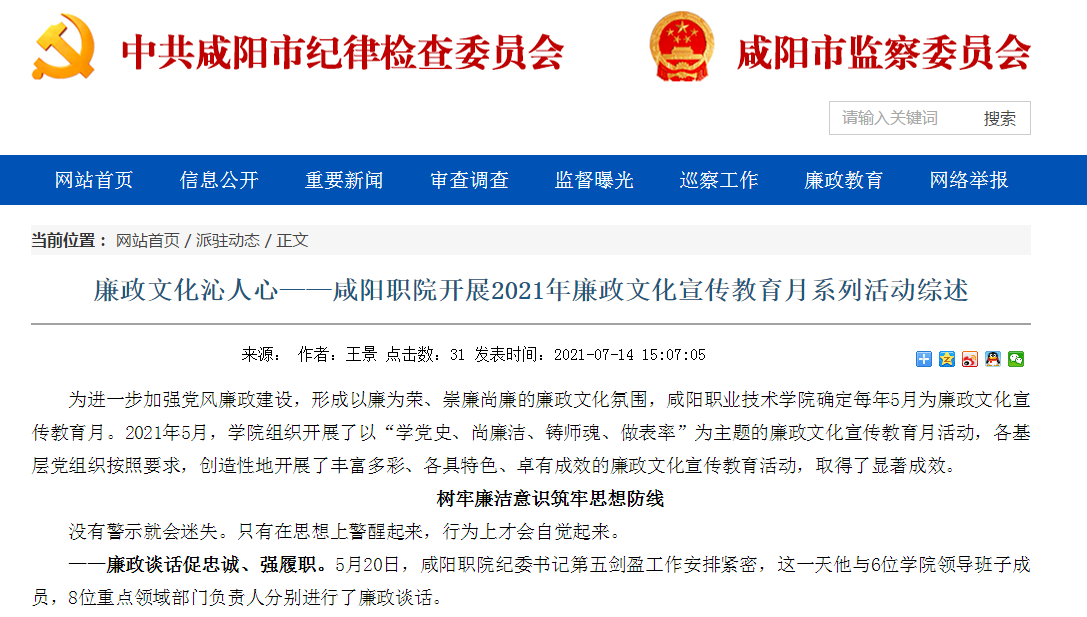 为进一步加强党风廉政建设,形成以廉为荣、崇廉尚廉的廉政文化氛围,咸阳职业技术学院确定每年5月为廉政文化宣传教育月。2021年5月,学院组织开展了以“学党史、尚廉洁、铸师魂、做表率”为主题的廉政文化宣传教育月活动,各基层党组织按照要求,创造性地开展了丰富多彩、各具特色、卓有成效的廉政文化宣传教育活动,取得了显著成效。
