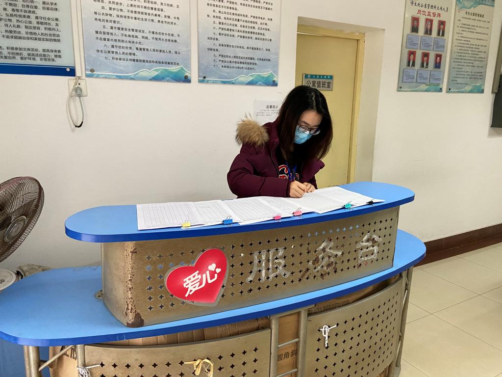纪委委员巨鲜婷:负责学生二公寓三层210名学生的管理工作和班主任工作。突如其来的疫情,对党员干部是一次考验,也是深刻的党性洗礼,作为一名年轻的老党员,必须冲锋在一线、战斗在一线!大疫面前,必须和学生在一起,面对面才能心贴心!