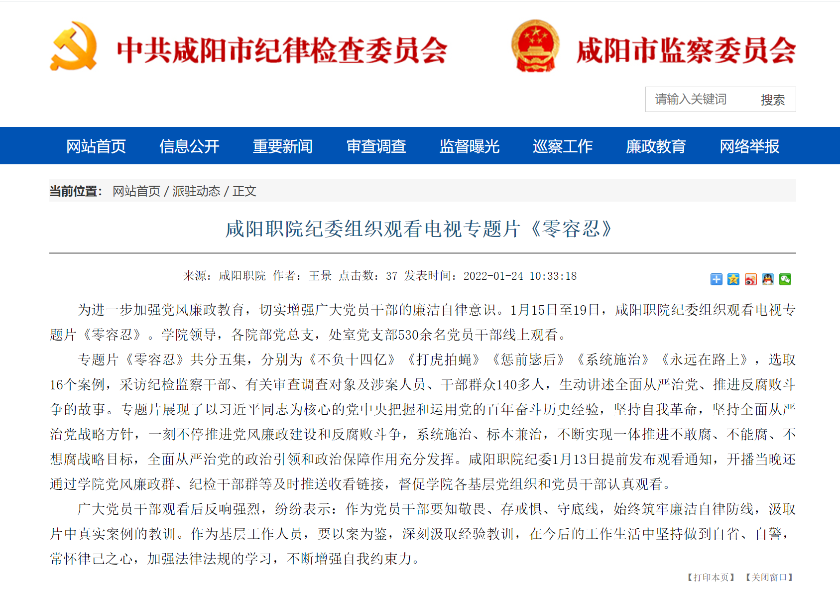 为进一步加强党风廉政教育,切实增强广大党员干部的廉洁自律意识。1月15日至19日,咸阳职院纪委组织观看电视专题片《零容忍》。学院领导,各院部党总支,处室党支部530余名党员干部线上观看。