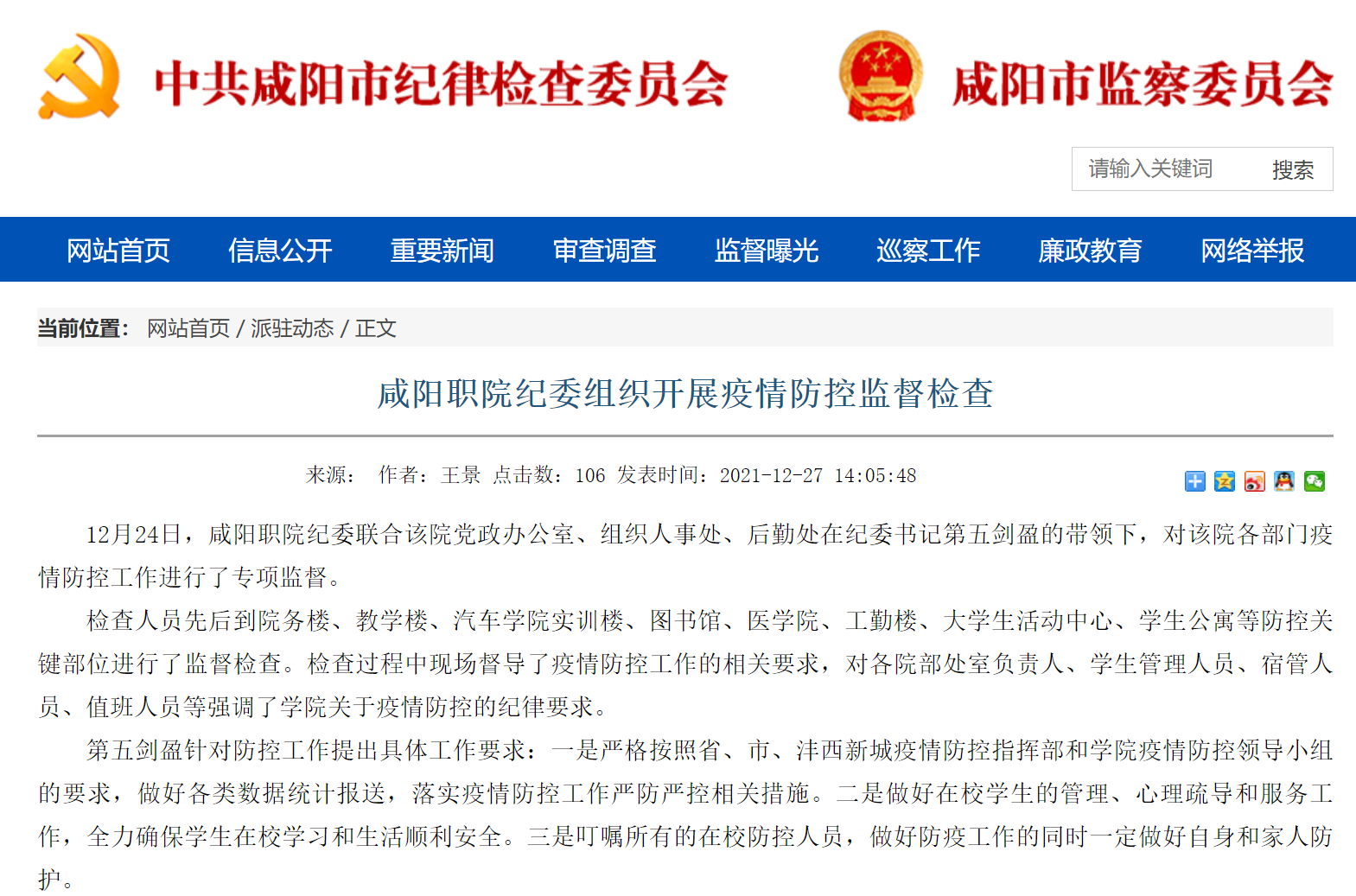 12月24日,咸阳职院纪委联合该院党政办公室、组织人事处、后勤处在纪委书记第五剑盈的带领下,对该院各部门疫情防控工作进行了专项监督。