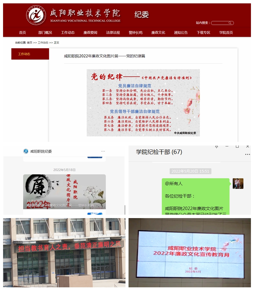 “廉洁从教品自高,清白为人气自华”“从师廉洁清如水,育人倾心似春蚕”……5月,行走在咸阳职院教学楼前,院务楼里,总能看到这些廉政宣传标语,崇廉尚廉已在我院蔚然成风。5月以来,咸阳职业技术学院陆续开展了以“强化作风建设提升,营造廉政文化氛围”为主题的廉政文化宣传教育月系列活动,丰富多元的教育活动,让廉洁意识入脑入心,进一步强化了各基层党组织和党员领导干部的纪律意识和规矩意识,营造了崇尚廉洁的校园浓厚氛围。